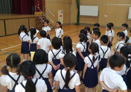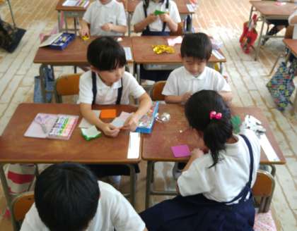 終業式の後、1年生が2年生に学校探検のお礼をしプレゼントを渡しました。1年生はそれぞれ、折り紙などで案内や説明をしてくれた2年生へ向けプレゼントを作りました。