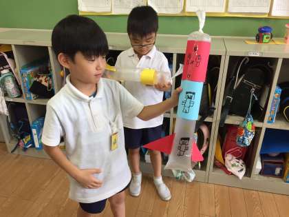 まずは、傘袋に空気を入れてロケットを作りました。画用紙で作った翼も付けて、びゅーんと思いっきり飛ばして、友だちと楽しんでいました。