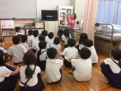 5日には発育測定があり、4月からの5か月間でずいぶん大きくたくましくなりました。今回の保健指導は「うんち」で、動物の食べ物と「うんち」の組み合わせを考えた後、自分たちの「うんち」について教えてもらいました。朝はトイレに行く時間を確保するために、早寝早起きが大切で、一番いいのは『バナナうんち』ということでした。