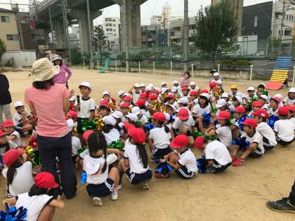 運動会本番では、手にきれいなおそろいの飾りを持って