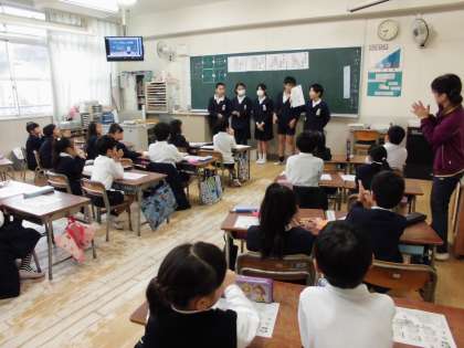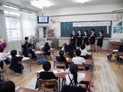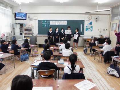 保健委員会の児童が、手洗いについて教えに来てくれました。「あわあわ手洗いのうた」のDVDを見ながら手洗いのしかたを練習しました。