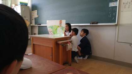 1年生は2年生の紙芝居にひきつけられるように聞き入っていました。お話は楽しく、絵も上手で驚いていました。