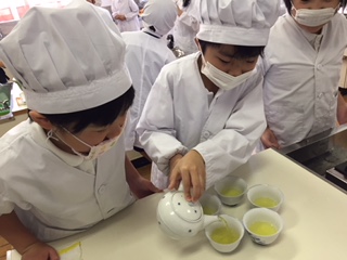 手順通りに元栓を入れ、火をつけて、火加減を調節してお湯をわかしました。そのあと、分量通りにお茶の葉を入れ、お湯を注ぎました。しばらく待ち、おいしいお茶ができあがりました。自分たちで入れたお茶は格別でした。おうちでも挑戦してね!