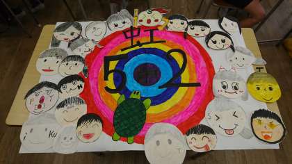 学級で話し合った結果、合言葉の「虹」を取り入れ、「虹色の輪」をテーマとしたデザインになりました。