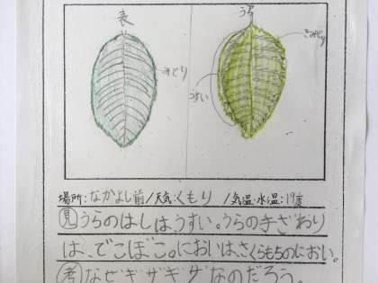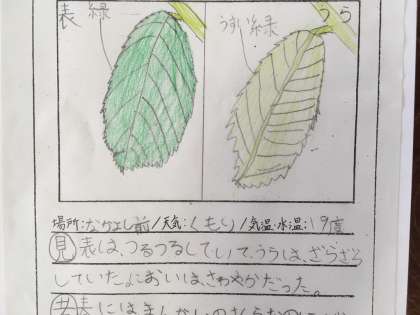 子ども達は、「葉の周りがギザギザ」「先は尖っている」「触ると裏の方がザラザラ」「桜餅のにおいがする!」など、五感を総動員してたくさんの発見をしていました。