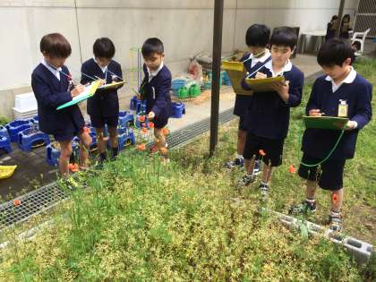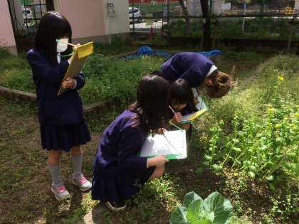 理科の「身近な生き物のかんさつ」の学習で、学習園に行きました。花や虫を見つけ、虫眼鏡を使って細かいところを見たり、わかったことを観察カードに書いたりしました。虫眼鏡を使うといろいろなものが大きく見え、見えなかったものを見つけるたびに驚きの声を上げていました。