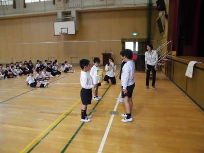 5月9日の1,2時間目に1・2年生で学校たんけんを行いました。生活科の学習で2年生が1年生を連れて学校の中を案内するというものです。2年生は一つ上の学年に進級したことを胸に1年生を優しくリードして学校中を案内することができました。学校たんけんのあとは1・2年生でみんな遊びのバナナおにをしました。最後に終わりの言葉と自分たちが1年生の時に育てたあさがおの種をプレゼントしました。1年生に優しく接していた姿はさすが2年生!!進級した喜びを大切にし、また、お兄さん、お姉さんとして自信をもって学校生活を送ってもらいたいものです。