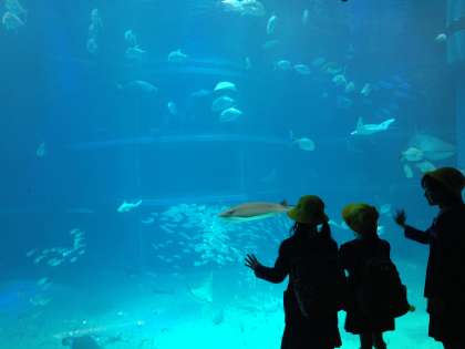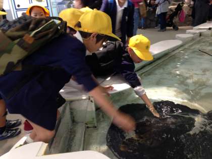 海遊館では、「この魚たち、本物?!」と驚きが大きかったようで、たくさんの歓声があがっていました。中でも、「めっちゃでっかい!」と一番歓声があがったのはジンベイザメを見たときでした。ガラス越しに見ていた子ども達にジンベイザメが近づくと、思わず「うわーっ!」と後ずさりする様子もみられました。次から次へと出てくる魚に大興奮でした。触れ合いコーナーでは、ツルツルしたエイと、ざらざらしたサメと触れ合いました。見るだけでなく触れ合うこともでき、とても充実した時間を過ごすことができました。遠足を通して、また一つ成長した姿をみせてくれました。