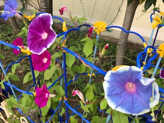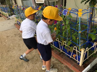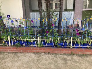子どもたちが、大切に育てているあさがおの花が、とってもきれいに咲いています。