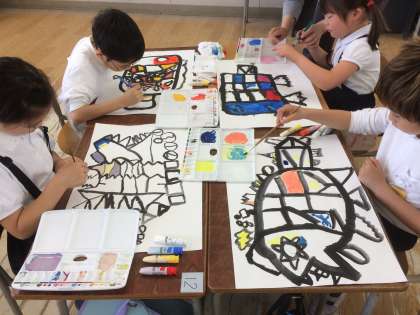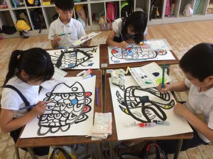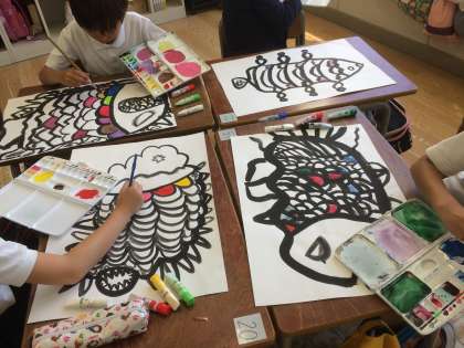 春の遠足では、海遊館でたくさんの海の生き物に親しんできた子ども達ですが、その後、どこにもいない自分だけの『ふしぎな魚』の制作に取り組んできました。魚全体やひれ、うろこの形を工夫するだけでなく、一つ一つのうろこの模様や彩色の仕方にも工夫を凝らして大作が出来上がりました。白色と好きな3色の絵の具だけで仕上げたとは思えないくらいたくさんの色を作り出すことができました。