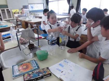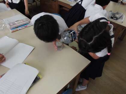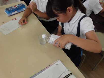 1dLのますでいろいろな入れ物に入る水のかさを調べたり、とうめいな入れ物を使って1Lのますを作ったりしました。子どもたちは「1Lってこれくらいなのか」や「1dLのますに水を入れるのにゆっくり入れよう」などと言いながら考えて作業をしていました。また、友だちと協力しながら活動をする子どもたちもたくさんいて子どもたちの成長を感じました。水のかさを学習すると生活に役立つことも感じていってくれたらと思います。