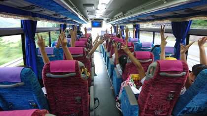 宿舎へは、11時半頃到着予定です。それまでは、バスの中で期待に胸をふくらませながら、みんなで楽しく過ごします。