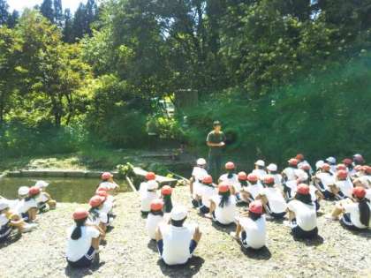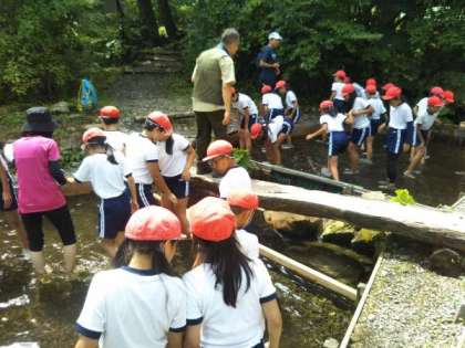 大自然の中を歩いて、川に到着しました。スタッフの方から「ヤマメ」と「アマゴ」の特徴を教えていただき、魚つかみのスタートです。上手に捕まえるとこができるかな?