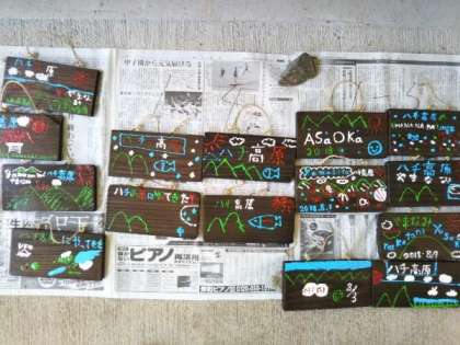 磨いた焼き板には、ハチ高原の自然の様子や、林間学習の思い出など、様々な絵を描きました。