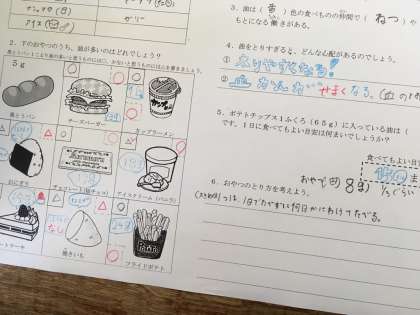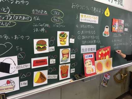 今回のテーマはズバリ、「油」です。普段子ども達が何気なく食べているお菓子にどれだけの脂肪分が含まれているか、そして、脂肪分を摂りすぎるとどうなるかというお話でした。