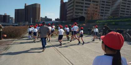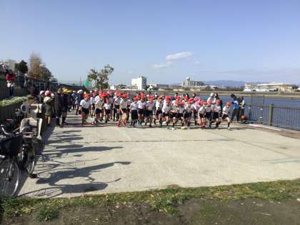 神崎川河川敷を約2.8キロメートル走ります。かけ足タイムや毎日の運動で身につけた持久力を知る機会です。この日のために運動場を30周の練習も行ってきました。