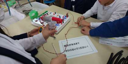 地球温暖化実験、太陽光発電実験、風力発電実験、静電気体験とたくさんの実験や体験をさせていただき、とても楽しくわかりやすい授業でした。