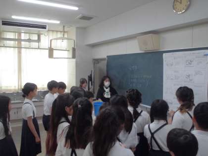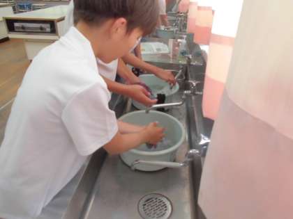家庭科の時間に手洗い洗濯の学習をしました。固形洗剤や液体洗剤を使ってもみ洗いや、つまみ洗いを実際に行いました。自分の靴下が綺麗になっていく様子が皆嬉しかったようで、楽しそうに取り組んでいました。
