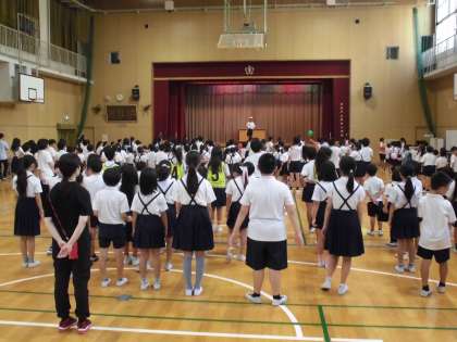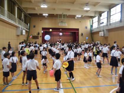 9月18日(木)朝、児童集会がありました。集会では、縦割り班で風船バレーをして楽しみました。6年生は、1年生のプレーを温かく見守りながらプレーをしていました。