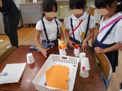 2年生が生活科で「動くおもちゃ」をつくりました。自分たちで遊んでみた後、1年生を招待して、1年生にも遊んでもらうことにしました。看板を作ってお客さん(1年生)を呼んだり、景品を作ったりして、2年生は大はりきり。1年生もだんだん遊び方のコツをつかみ、上手におもちゃを動かすことができました。終わった後、感想を聞いてみるとみんな大満足だったようです。