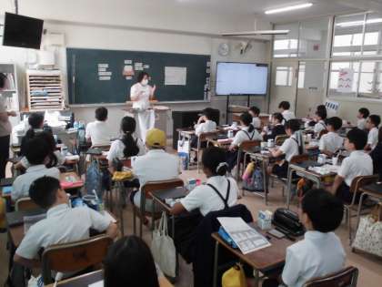 歯科衛生士の先生から口や歯について教えていただきました。「歯ッピーカード」で自分の口や歯の健康状態などをチェックしたり、「そしゃくチェックガム」を噛んで、よく物を噛んでいるかチェックしたりしました。