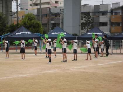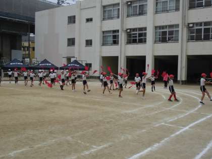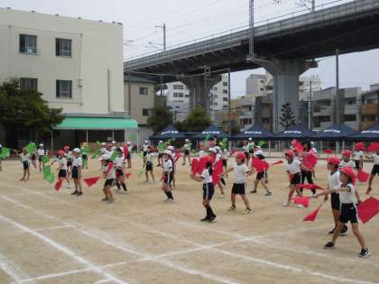 10月3日(金)2限目、3年生は体育の授業です。授業では、運動会での団体演技の練習をしました。音楽に合わせて、赤の旗や緑の旗を振って楽しそうに踊っていました。