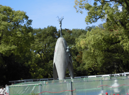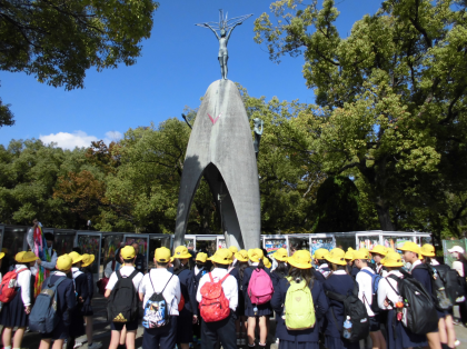 平和集会を行いました。野中のみんなで作った千羽鶴を捧げてきました。『折り鶴』をうたいました。