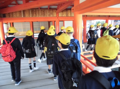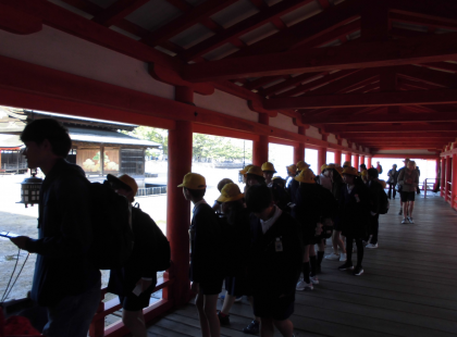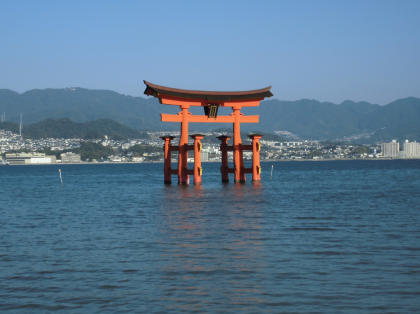 朝の厳島神社に参拝に行きました。潮が満ちてきて昨日とはまた違った様子を見ることができました。