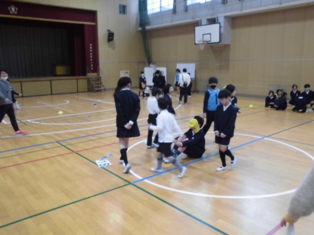 2月26日(木)朝、児童集会で一年間お世話になった6年生と楽しく遊ぶ「たてわり班であそぼう」を行いました。たてわり班の各班長を中心に6年生が決めた「大なわとび」「だるまさんが転んだ」「かごめかごめ」「はないちもんめ」「ハンカチ落とし」などのゲームをして楽しく遊びました。児童は声をだして、飛んだり、跳ねたり、止まったり、回ったりして楽しんでいました。そしてまた6年生との楽しい思い出が出来ました。