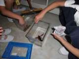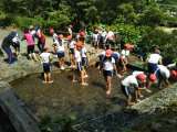 「冷たーい!」と川の水の冷たさに驚きの声が飛び交いました。それでも必死に魚をつか...