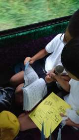 道の駅ドライブインに到着しました。 バスの中では、子ども達が手作りした「歌集」を...