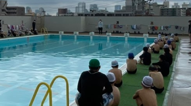 水泳の授業のでは、水慣れや、イルカジャンプ、蹴伸び、ビート板を使ってバタ足などを...