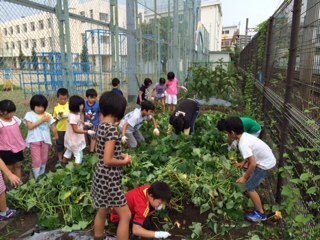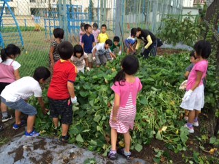 まさにつるを「ひっくり返している」子どもたちは生い茂ったつるに悪戦苦闘しながらも楽しく活動することができました。