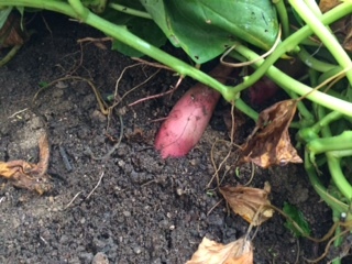 つる返しとは、土に触れているつるの途中部分から根が土中に伸び、放置しているとそこからイモが出来はじめます。そうなると養分が何カ所かに分散し、良いさつまいもができません。そこでつる返しという作業をします。2枚目の写真がつるの途中でできてしまったさつまいもです。これを阻止します。