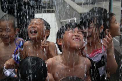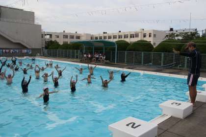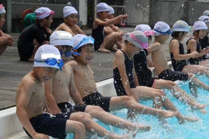 2時間目には中学年の、3時間目には低学年の初プール授業を行いました。1年生のこどもたちは、ドキドキで小学校の大きいプールに入りましたが、水が浅くて一安心。まだ水が少し冷たかったのですが、こどもたちは大喜びでした。
