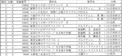 ジャジャジャジャ———ン!1学期の貸し出しで人気のランキングを発表します!下の表は上から低学年、中学年、高学年と並んでいます。