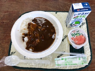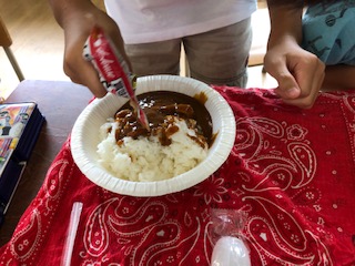 災害訓練を想定して、それぞれ紙皿にごはんを森、レトルトのカレーをかけて食べました。