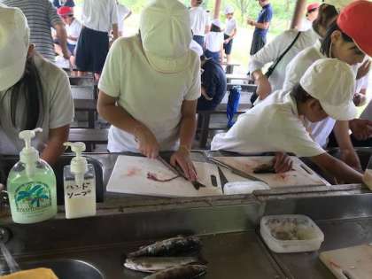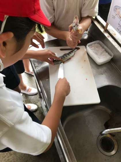 捕まえたお魚は、自分でさばき、炭火で焼いていただきます。