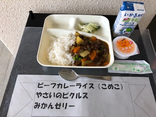 今日から2学期の給食が始まりました。ビーフカレーライス、野菜のピクルス、みかんゼリー、牛乳です。8月9月10月と食物アレルギー対応サポート月間で、今日は米粉のカレールウを使い、小麦アレルギーの人も食べられるカレーでした。いつもよりあっさりとしたカレーライスも子どもたちに好評でした。