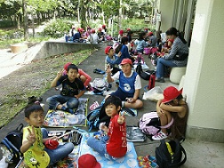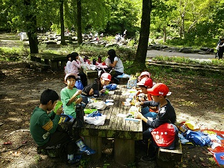 朝早くからお弁当を作ってくださったお家の方に感謝しながら、お弁当を食べています。さわやかな秋空のもと、なかよし班のみんなと食べるお弁当は最高です!