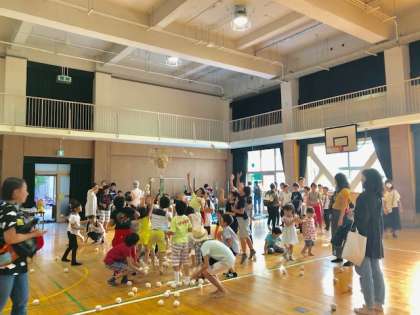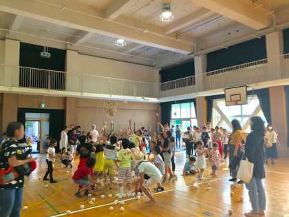 よもよもさんによる、絵本の読み聞かせのあとは玉入れを楽しみました。赤組も白組もがんばぅて!