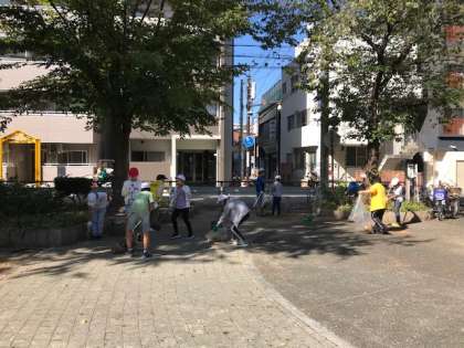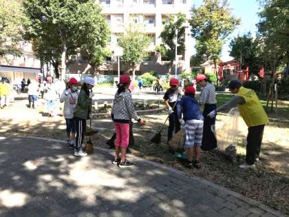 十三東女性部のみなさんは月に一度十三東公園の清掃を行っていらっしゃいます。いつも地域のみなさんにお世話になっている十三小学校を代表して、5年生が春に続いて秋にも一緒に清掃活動をさせていただきました。