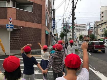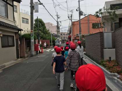 全校なかよし遠足を来週に控えた今日、地域・保護者の方々のご協力を得て、なかよし班ごとに学校周辺道路を安全にまた整然と歩く練習をしました。上級生が下級生の面倒をよくみて、仲良く安全に歩くことができていましたと、連合町会長さんにほめていただきました。