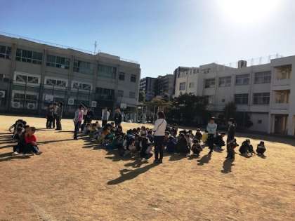 まずは、地震が起こったという想定で机の下で身を守り、運動場に避難しました。