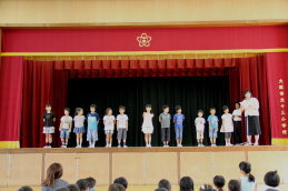 本校では、この一学期、読書運動やなわとび運動、音頭・暗唱に取り組んできました。その中で、早くもこの一学期に「読書名人」「なわとび3級」「なわとび名人」「なわとびスーパー名人」になった人たちがいたので、その人たちに校長先生より認定書の授与がありました。2学期も認定書の授与を行いますので、この夏休みも続けて頑張ってほしいです。