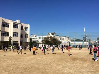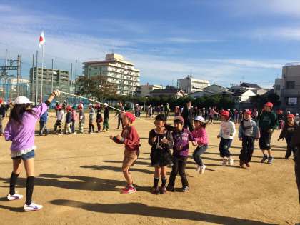 1年生から6年生まで、班のみんなで声をかけあって長縄をとびます。