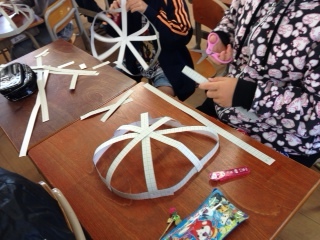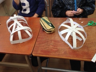 作品展に向けて、お面作りをしています。まず工作用紙で骨組みをしました。長さを調節して、輪郭を変えるなど、みんな工夫をしていました。この骨組みからどんなお面が出来上がるか楽しみです。