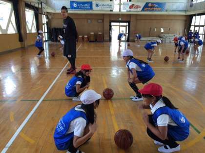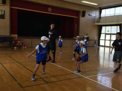 大阪エヴェッサのつよしコーチと佐藤選手が来校し、バスケットボールの楽しさを教わりました。