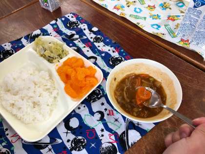今日の給食は「ハヤシライス、キャベツのひじきドレッシング、みかん(缶)、牛乳」でした。十三小学校は、十三中学校の給食を作って運んでいる親子給食をしています。今日は、中学校3年生のためにハヤシライスにラッキーにんじんを入れました。みなさん、ラッキーにんじんを見つけて楽しそうに給食を食べていました。