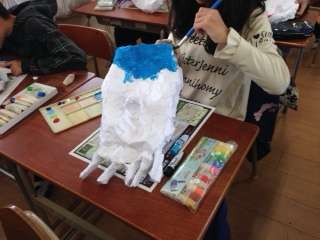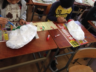 お面にいよいよ色をぬっていきました。お面を見て、みんながびっくり!?にっこり!?するような表情を考えて取り組んでいきました。完成したものは、作品展で見ていただければと思います。